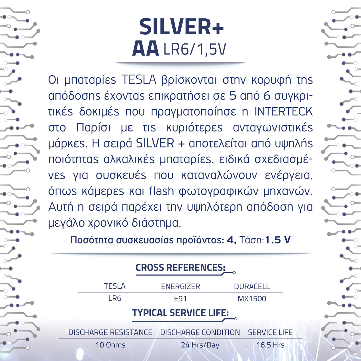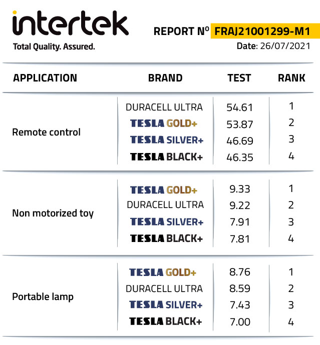 Οι μπαταρίες TESLA βρίσκονται στην κορυφή της απόδοσης έχοντας επικρατήσει σε 5 από 6 συγκριτικές δοκιμές που πραγματοποίησε η INTERTECK στο Παρίσι με τις κυριότερες ανταγωνιστικές μάρκες. Η σειρά SILVER + αποτελείται από υψηλής ποιότητας αλκαλικές μπαταρίες, ειδικά σχεδιασμένες για συσκευές που καταναλώνουν ενέργεια, όπως κάμερες και flash φωτογραφικών μηχανών. Αυτή η σειρά παρέχει την υψηλότερη απόδοση για μεγάλο χρονικό διάστημα.